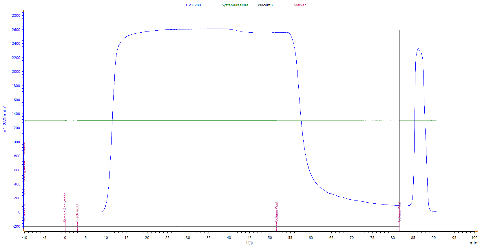 純化過程:取3 mL的Protein A Agarose裝填于1*10 cm的HiQumn?CTN35玻璃層析柱中,使用至少10 CV的緩沖液A平衡柱子,流速1 mL/min進樣,緩沖液A淋洗至基線平穩,緩沖液B進行洗脫,收集200 mAu以上部分,并立即使用緩沖液C進行中和。