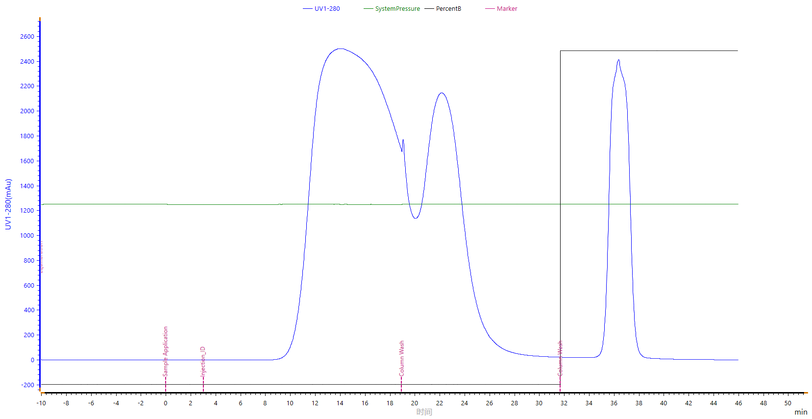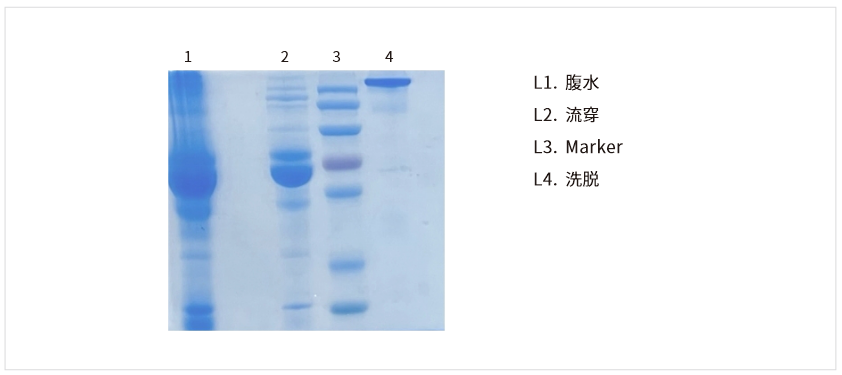 純化過(guò)程:取3 mL的Protein A Agarose裝填于1*10 cm的HiQumn CTN35玻璃層析柱中,使用至少10 CV的緩沖液A平衡柱子,流速1 mL/min進(jìn)樣,緩沖液A淋洗至基線平穩(wěn),緩沖液B進(jìn)行洗脫,收集200 mAu以上部分,并立即使用緩沖液C進(jìn)行中和。